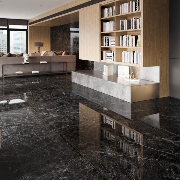 El acabado pulido proporciona una superficie brillante y reflectante, creando un efecto de lujo y luminosidad. El formato 60×120 y el borde rectificado permiten una instalación con juntas mínimas, creando una sensación de amplitud y continuidad.
