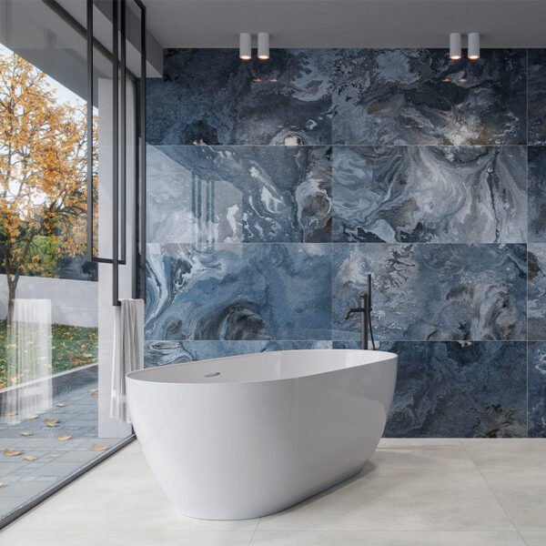La serie Urano se distingue por su diseño de mármol con vetas fluidas y elegantes sobre fondos distintivos, creando ambientes con personalidad. El acabado pulido realza el brillo de las baldosas, reflejando la luz y aportando un toque de sofisticación. El formato rectificado de 60×120 permite una colocación con juntas mínimas, logrando superficies continuas y una estética moderna y limpia.